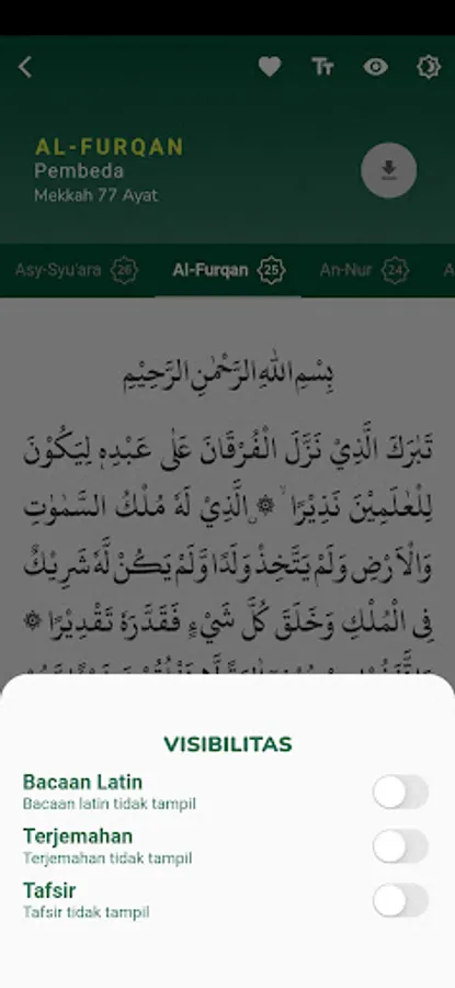 ✔ Show Pronunciation, Translation and Tafsir Separately: