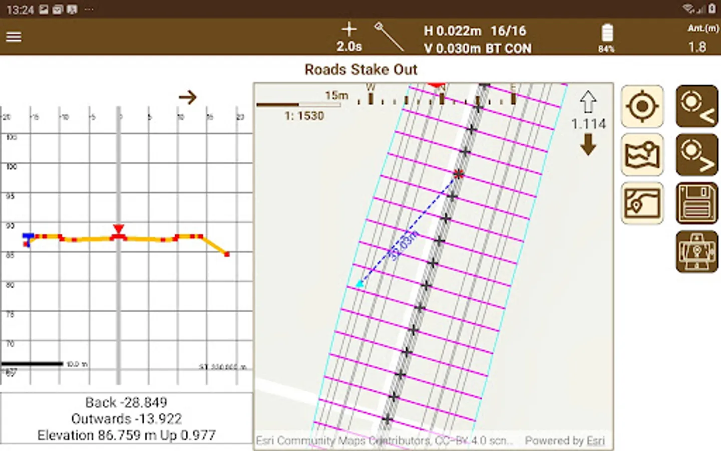 The professional version of TcpGPS is very useful for working on road, railroad and linear projects in general, being able to import LandXML files and other formats. It is possible to stake out points with respect to the alignment, or specific vertices such as road edge, shoulder, curb, pavement footing... Specific options for slope control are also available.