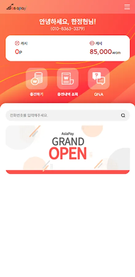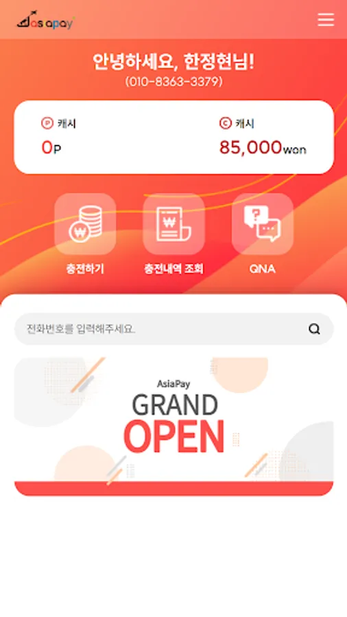 This is ASIAPAY (Asia Pay), a prepaid charge charging application used in Korea.