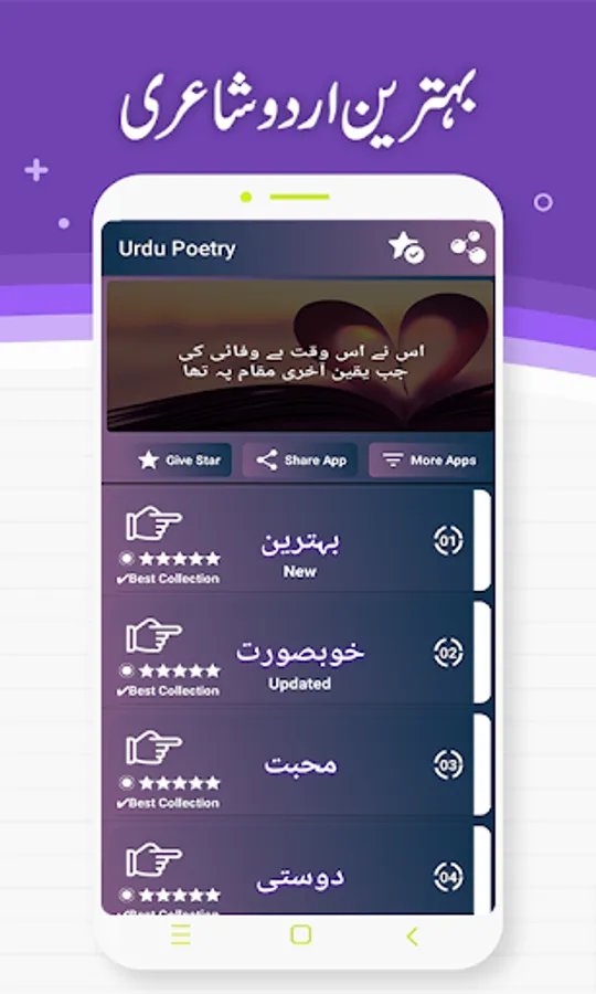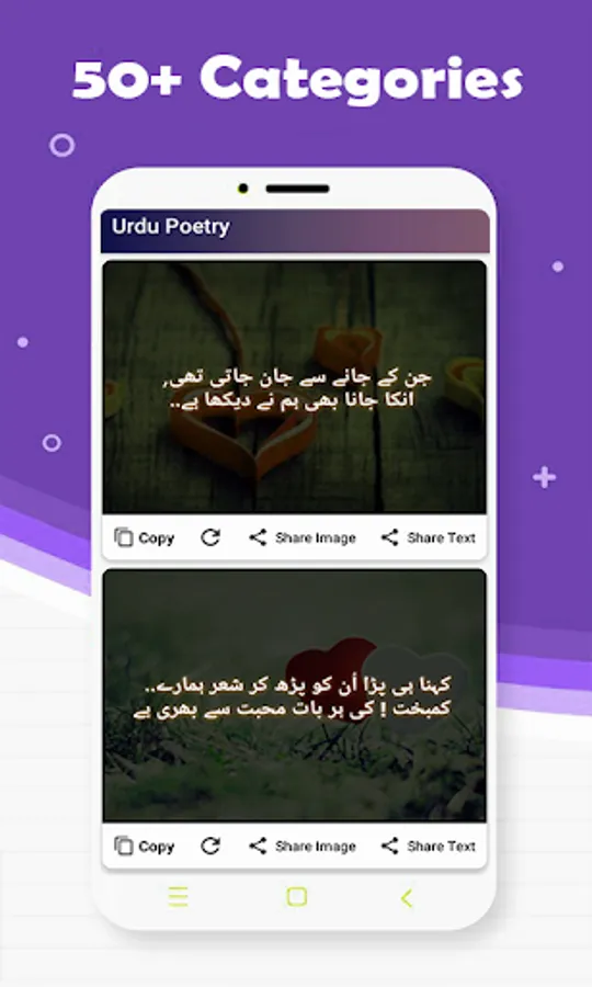 Urdu Shayari have more then 15+ different categories of Urdu shayari. It has a unique Ui design with dark color. Our team is collecting more and more Urdu Shayari and we are updating our app at every end of week with latest urdu shayri.