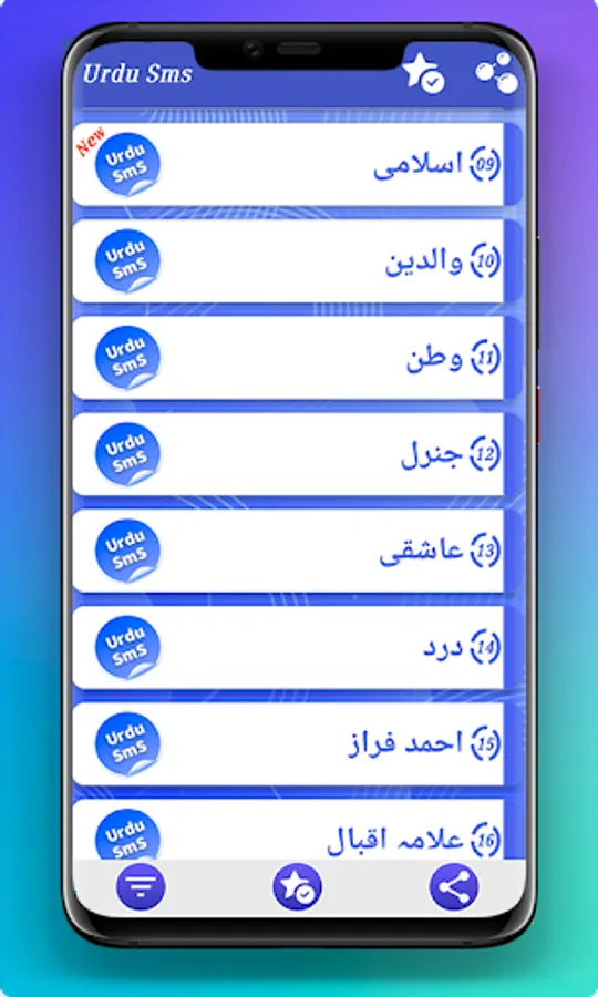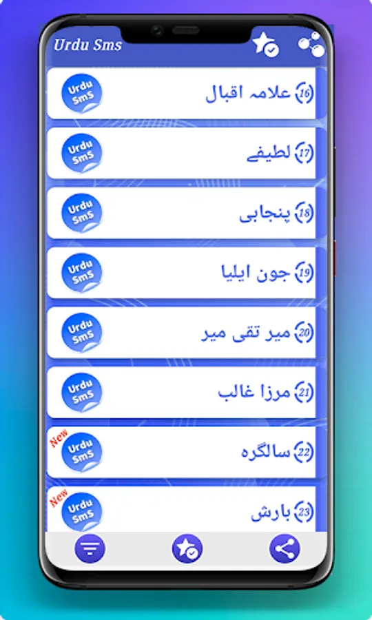 Urdu Sms app have all time best and unique poetry collection. There more then fifteen different categories of Urdu poetry.