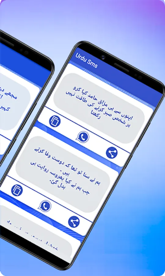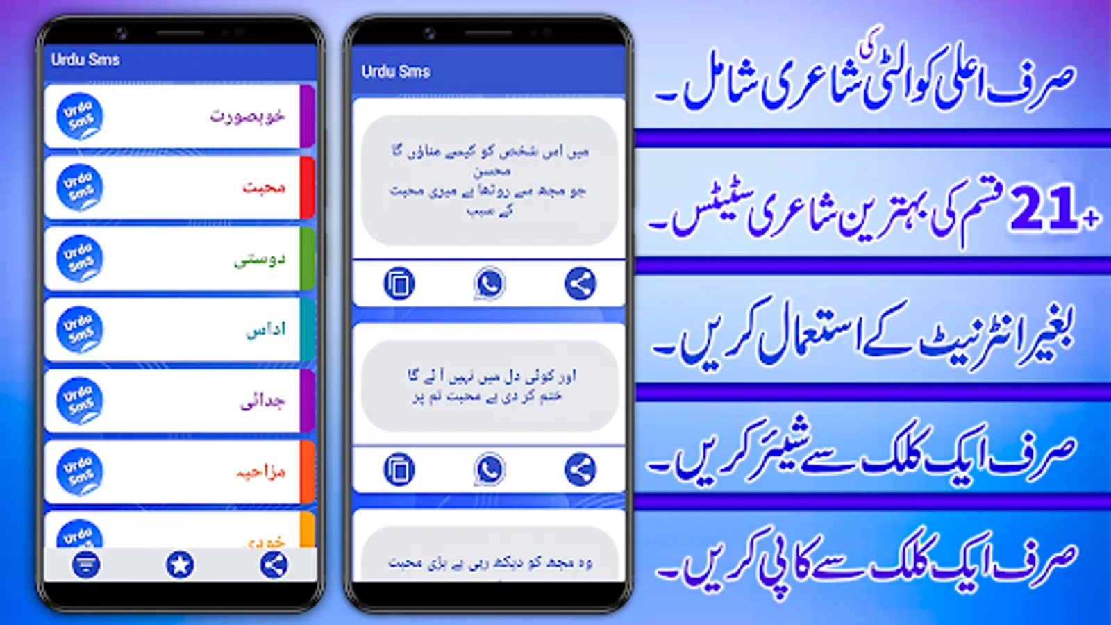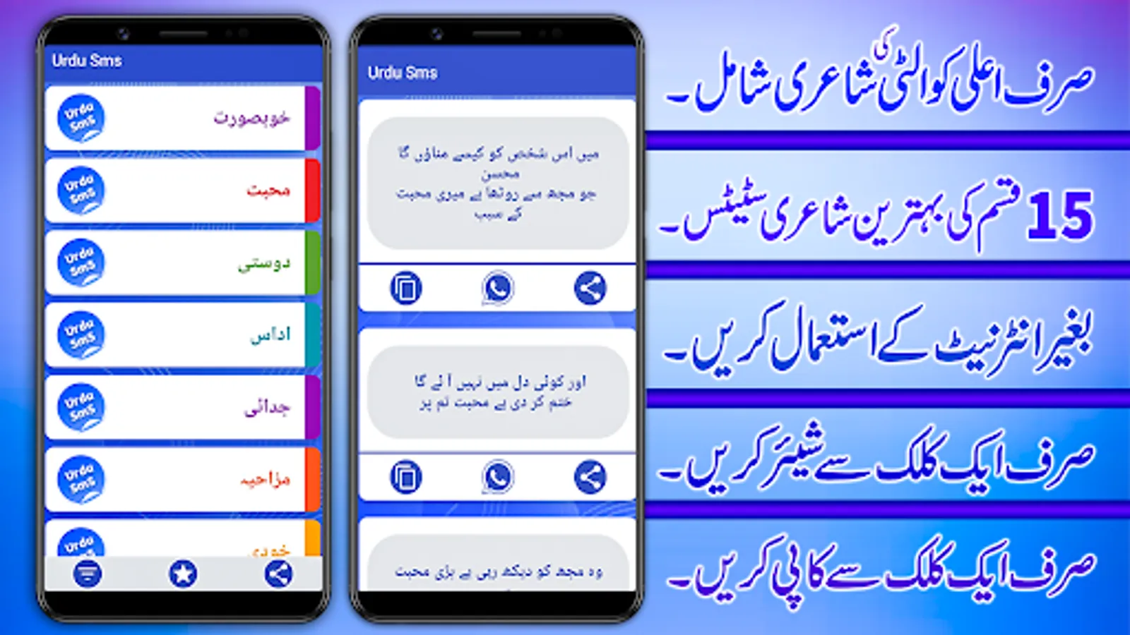 Urdu SMS Lite is the largest collection of Urdu Poetry messages that belongs to different categories. You can send your Poetry directly from this app through SMS, Viber, Whatsapp, Facebook, Twitter, Hangouts etc. loved ones.