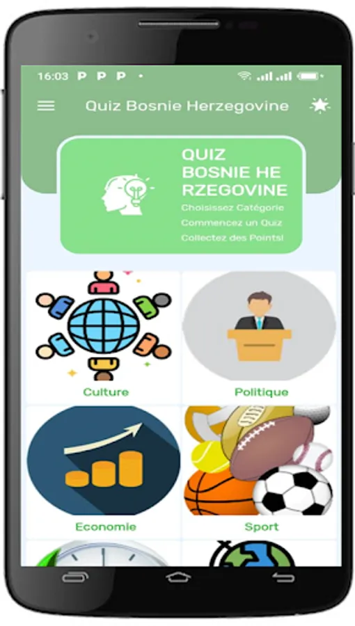 L'application "Quiz Bosnie-Herzégovine" est une plateforme interactive conçue pour permettre aux utilisateurs de découvrir et d'approfondir leurs connaissances sur la Bosnie-Herzégovine à travers une série de quiz captivants. L'application propose six thématiques principales, à savoir la culture, la politique, l'économie, le sport, l'histoire et la géographie de la Bosnie-Herzégovine.