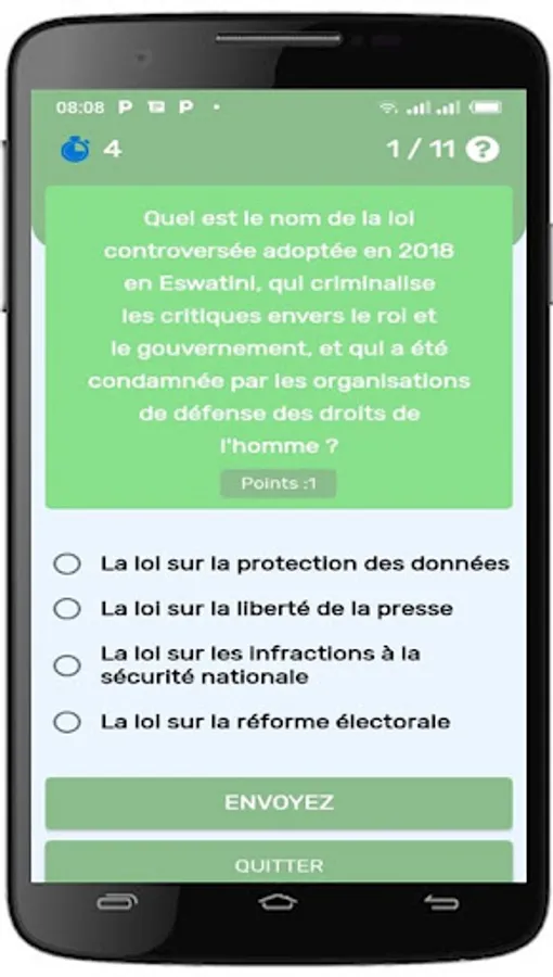 The "Quiz Eswatini" application is a great way for users to discover Eswatini in a fun and interactive way. It offers a wide variety of quizzes in different themes, as well as a choice of difficulty levels to adapt to the level of knowledge of each user.