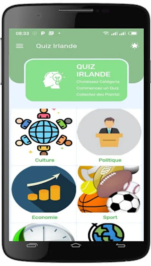 When the application is launched, the user is greeted by a user-friendly interface which allows him to choose from the six themes available: culture, politics, economy, sport, history and geography. This initial selection allows the user to personalize their gaming experience by choosing the topics that interest them the most.