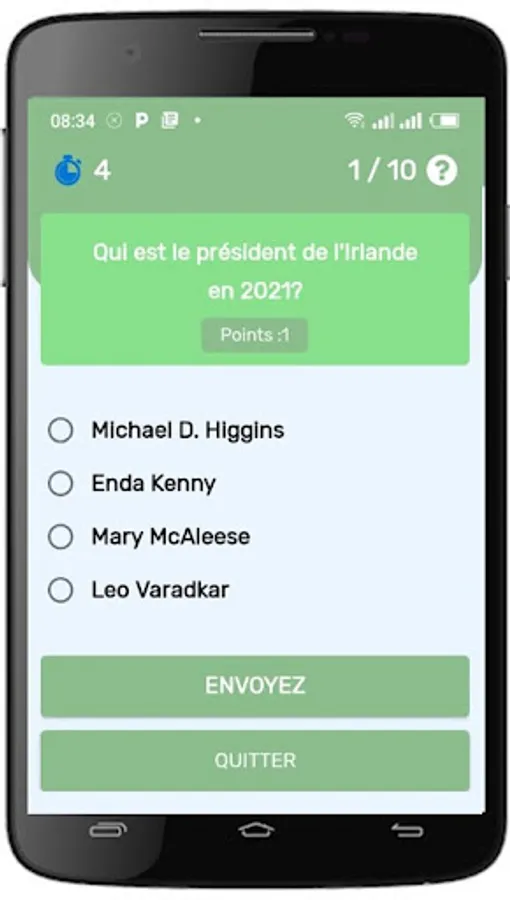 The "Quiz Ireland" application also offers additional features to improve the gaming experience. For example, the user can change level or theme at any time, allowing him to explore different aspects of Ireland according to his preferences. Additionally, the app keeps a history of the user's scores and performance, allowing them to track their progress and challenge their own records.