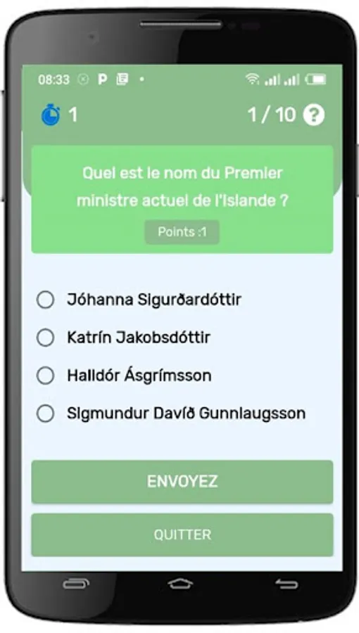 With "Iceland Quiz", users can not only test their knowledge about Iceland, but also learn more about the culture, politics, economy, sports, history and geography of this beautiful Nordic country. . Whether for moments of relaxation or to deepen their knowledge, this application offers an educational and entertaining experience for all lovers of Iceland.