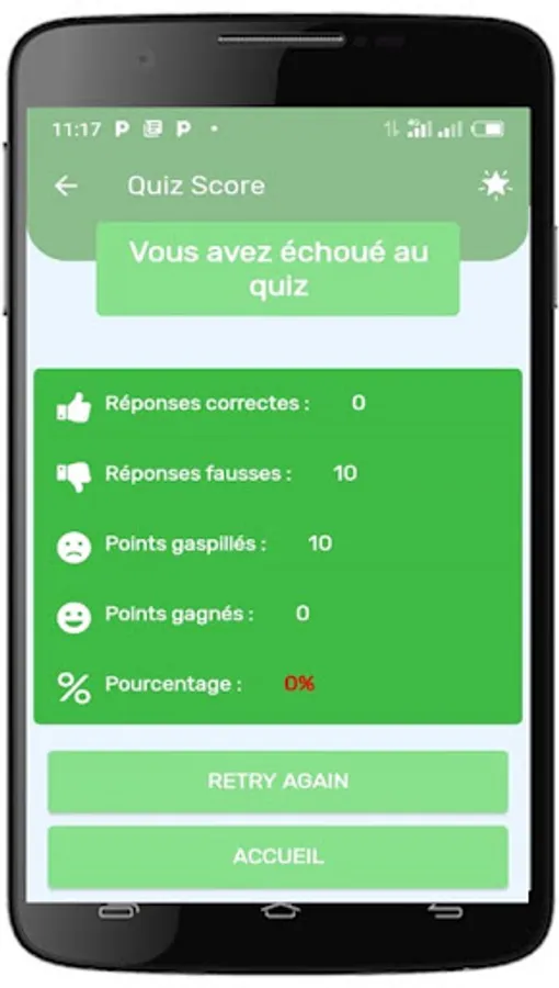 When the player has completed all the quizzes of a difficulty level, they receive a cumulative point total for that level. He can then choose to go to a higher difficulty level, change the theme or stop playing.