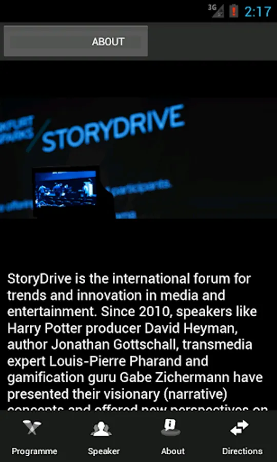 StoryDrive is the international forum for trends and innovation in media and entertainment. Since 2010, speakers like David Heyman, author Jonathan Gottschall, transmedia expert Louis-Pierre Pharand and gamification guru Gabe Zichermann have presented their visionary (narrative) concepts and offered new perspectives on the media world of tomorrow.