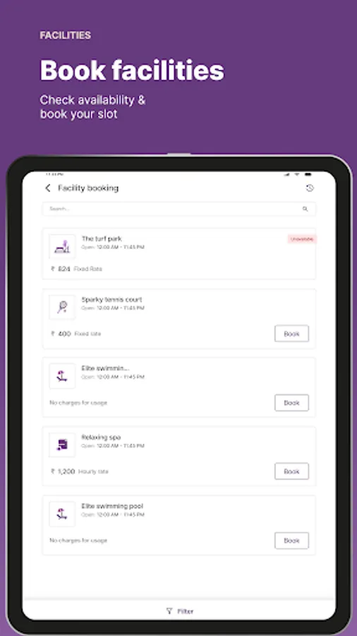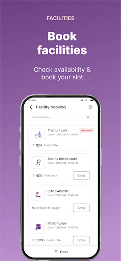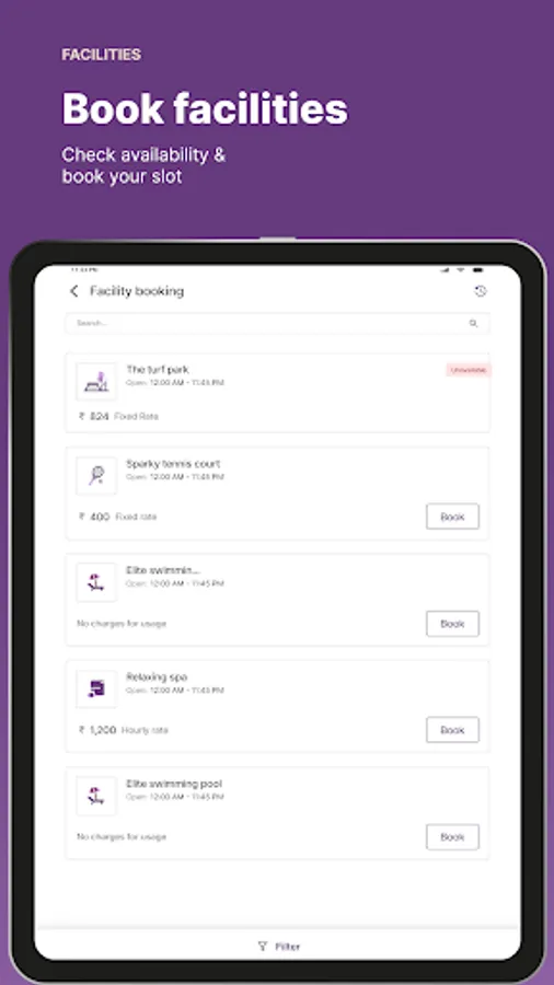 • Book a facility such as a tennis court, gym, clubhouse, party hall, etc.