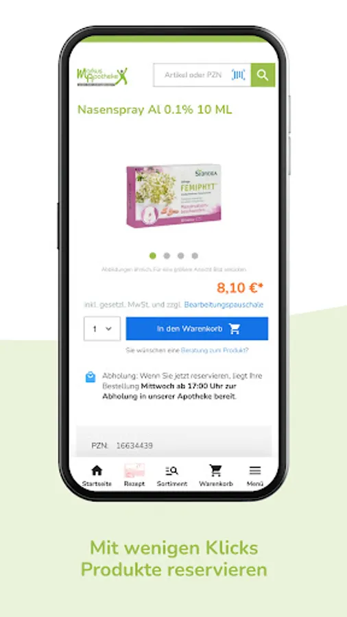 Please note that we are obliged to provide pharmaceutical advice for products that are sold in pharmacies. The consultation takes place either when you pick it up at our pharmacy, when it is handed over to you at home or by telephone.