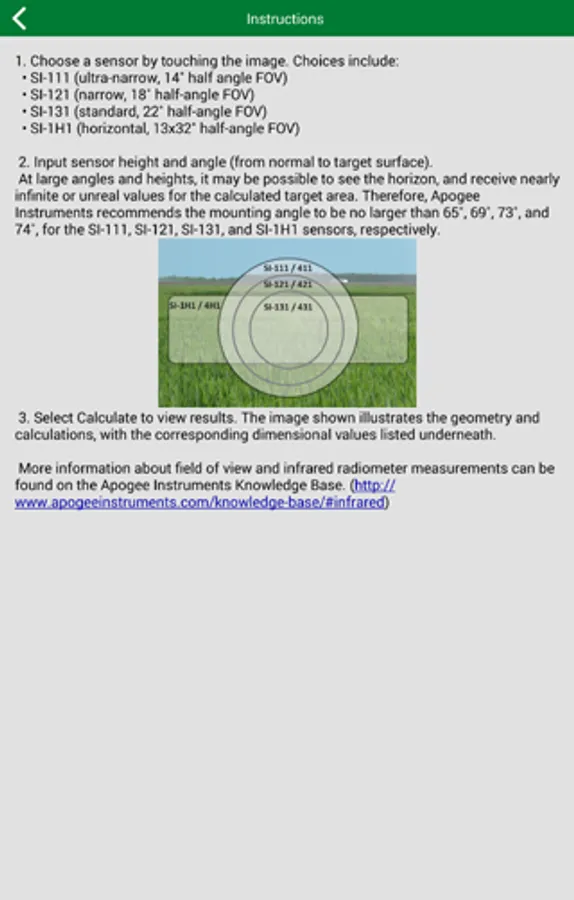 One of the most important steps in using an infrared radiometer from Apogee instruments is determining the exact field of view of the sensor during installation. The mounting geometry (distance from target surface, angle of orientation relative to target surface) is determined by the desired area of surface to be measured. The field of view extends unbroken from the sensor to the target surface. Sensors must be carefully mounted in order to view the desired target and avoid including unwanted surfaces/objects in the field of view, thereby averaging unwanted temperatures with the target temperature.