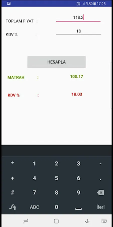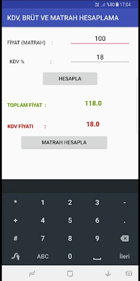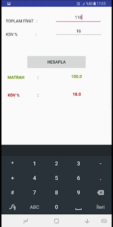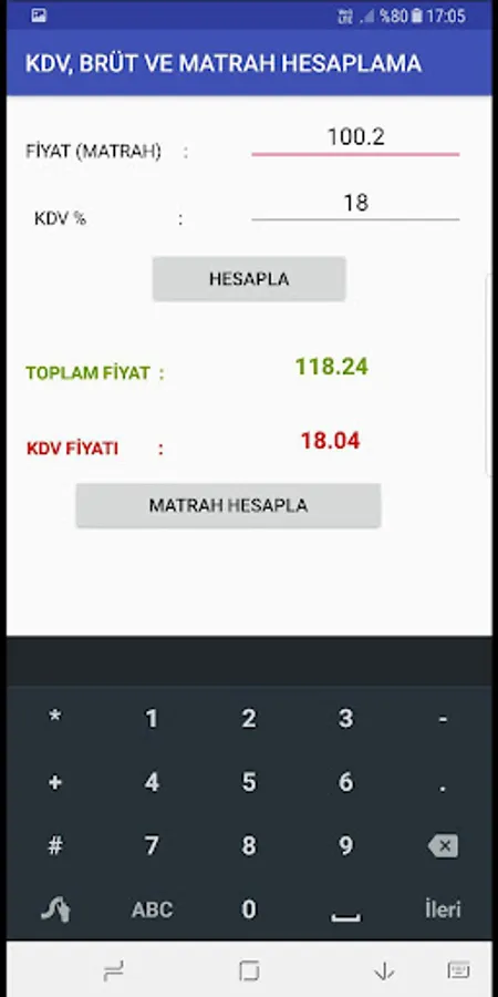 This simple and useful applications with your products and services to the Value Added Tax (KDV's URL), the Base (KDV 'first net prices) and total price (gross) can learn. KDV percentage, 18% is taken as the base rate when you enter.