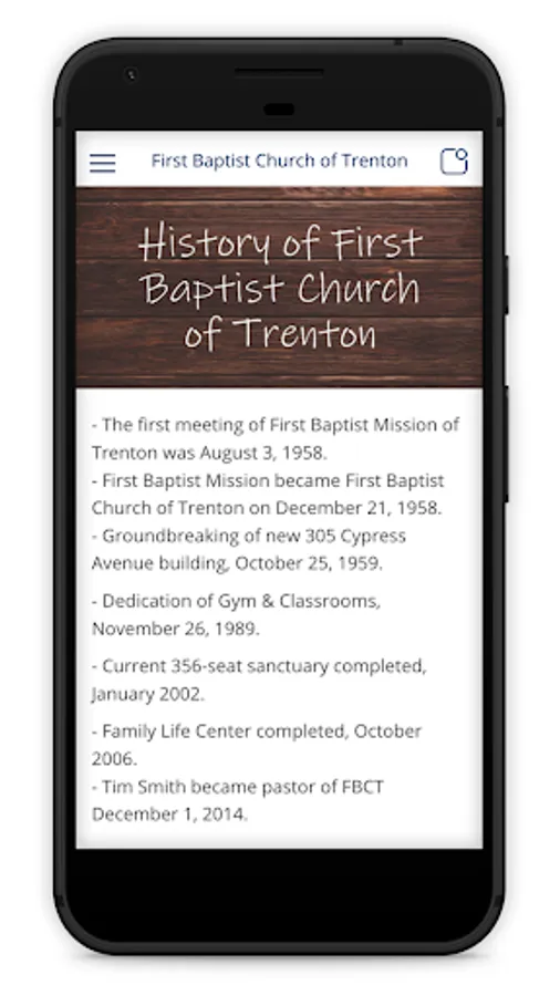 This is the official app of First Baptist Church of Trenton! Download this app to stay connected with news, podcasts, info, and more. Let your smartphone help you connect, grow, and engage!