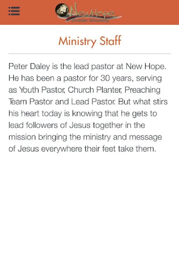 This is the Official New Hope Christian Fellowship Church of Virginia Beach, VA app! When you download this app you are a click away from connecting to our people and mission through gathering, serving, extending creative hospitality, giving, or listening to a message from Pastor Peter. You are welcome here! You also have quick access to our calendar, location, times and resources like sermon notes, and Bible reading helps. Don't forget to check out our website at www.newhopetoday.org
