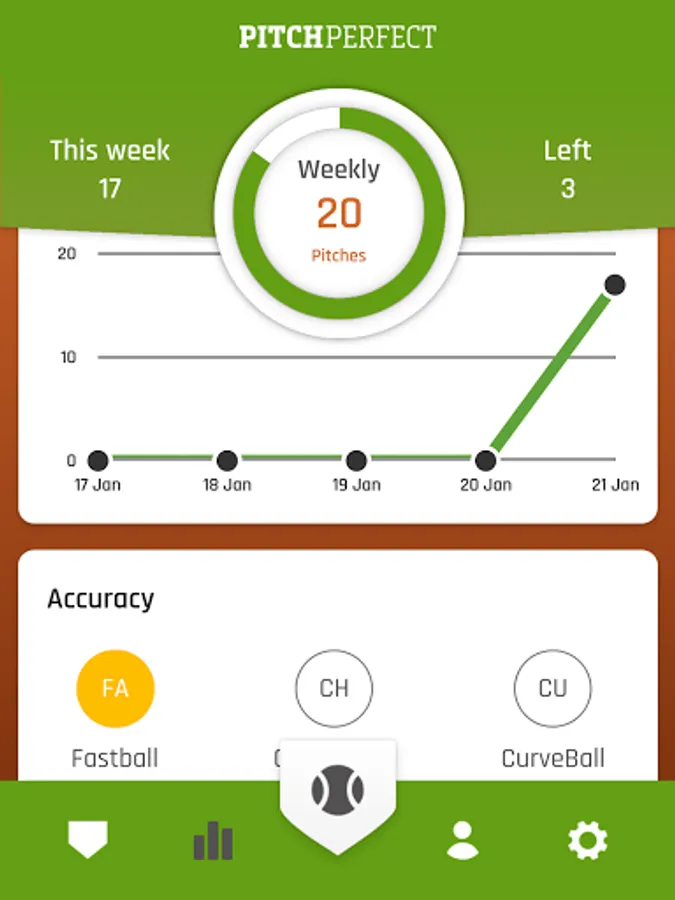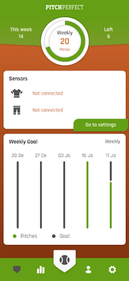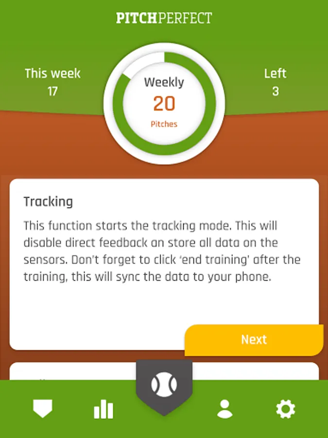 The PitchPerfect sensors are fitted with a tracking mode that you can activate with the app. Select the tracking mode and start to track all your throws during training and workout, without paying any attention. PitchPerfect will automatically count all your pitches and throws and provide you with a day-to-day overview of your pitch counts.