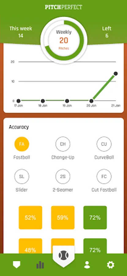 The App provides you with 24/7 access to your workout data. The stats-menu shows day-to-day pitch counts and has interactive overviews of training types, pitch types and pitch locations.