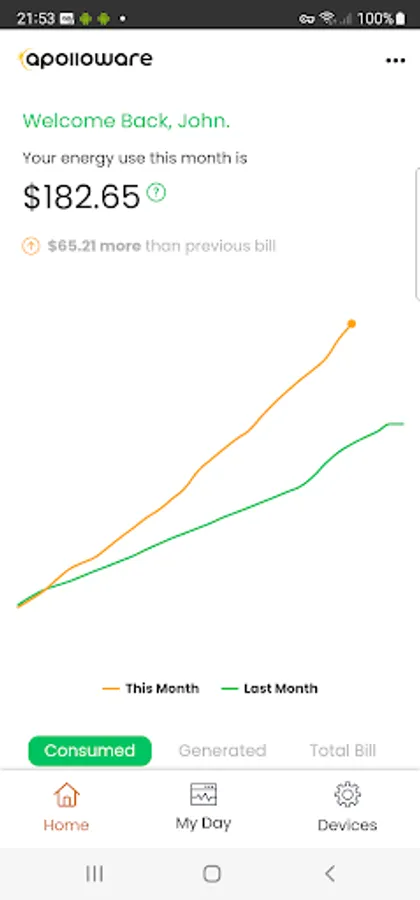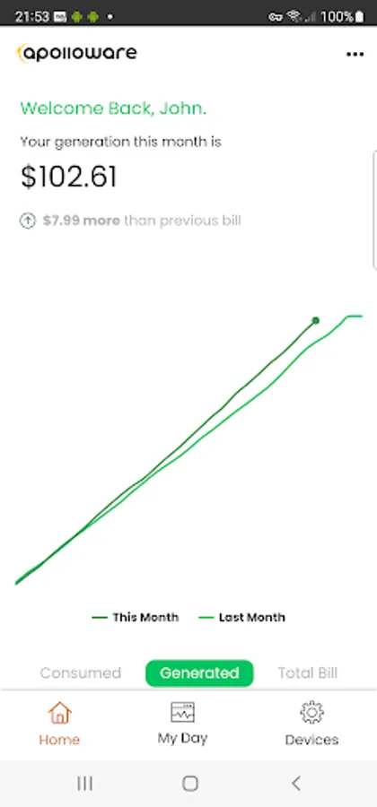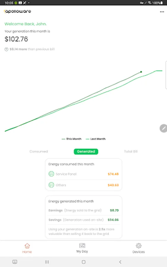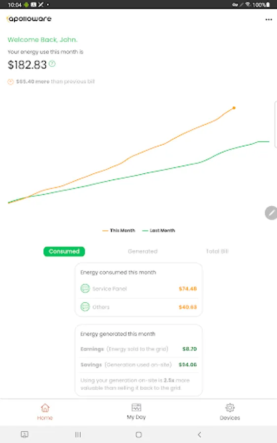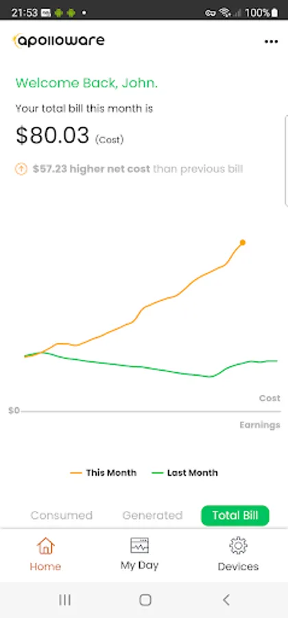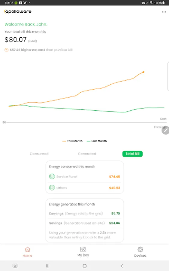 Visualise solar production vs. energy consumption costs in real-time.