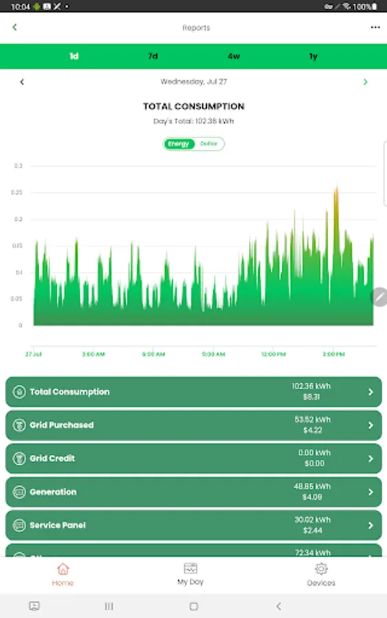 Monitor current energy generation and consumption by date and time of day.