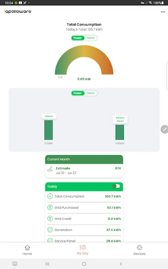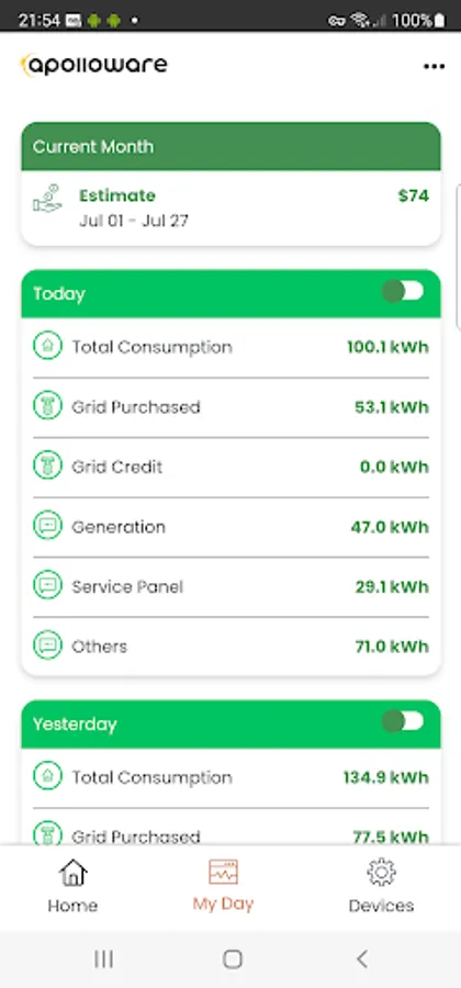 Apolloware Control Module (ACM) installs on residential and commercial buildings where it monitors various appliance, solar panel power and inverter, and electric service circuits. The ACM transmits this data to a secure Apolloware cloud using the local internet connection. Homeowners and authorised users can view this data from any device through the Apolloware mobile app or website.