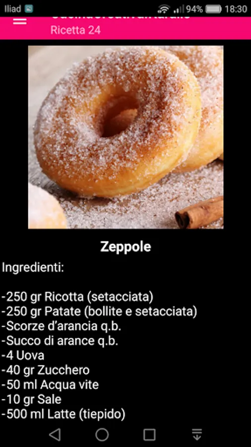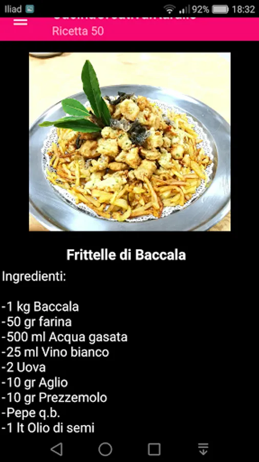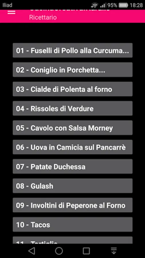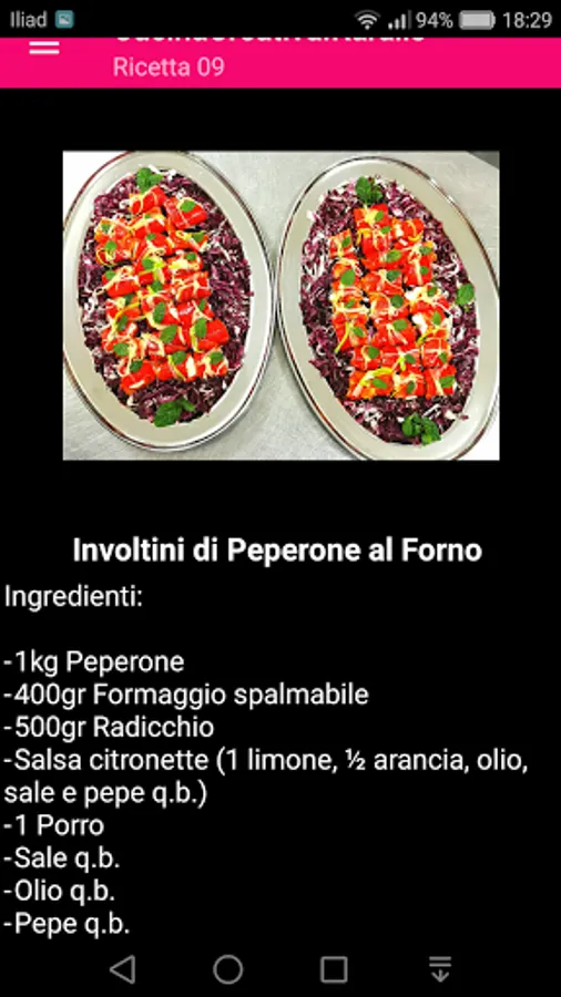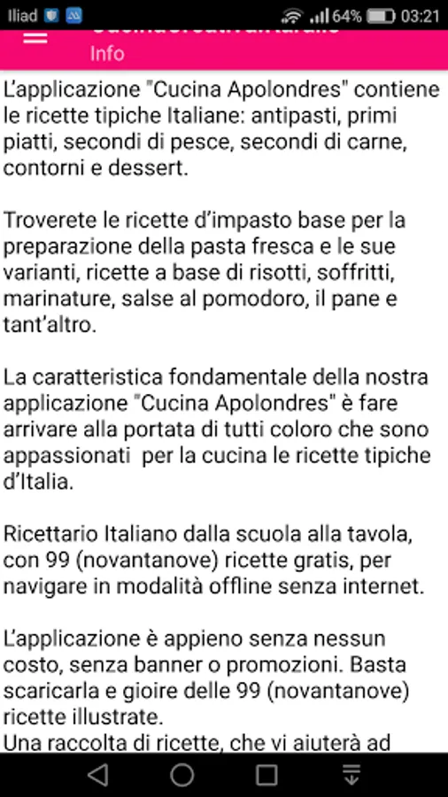 The "Cucina Italiana Apolondres" application contains typical Italian recipes: appetizers, first courses, fish main courses, meat main courses, side dishes and desserts.