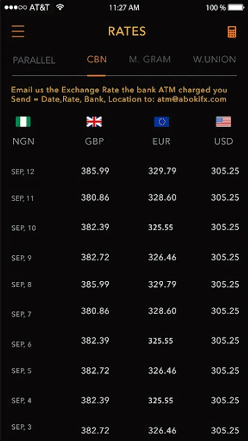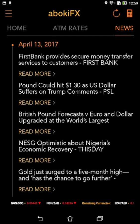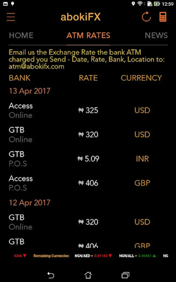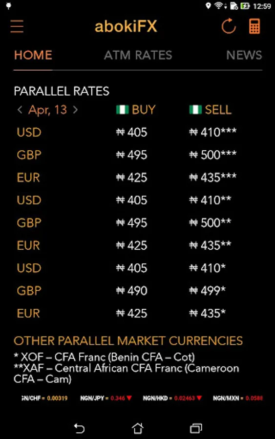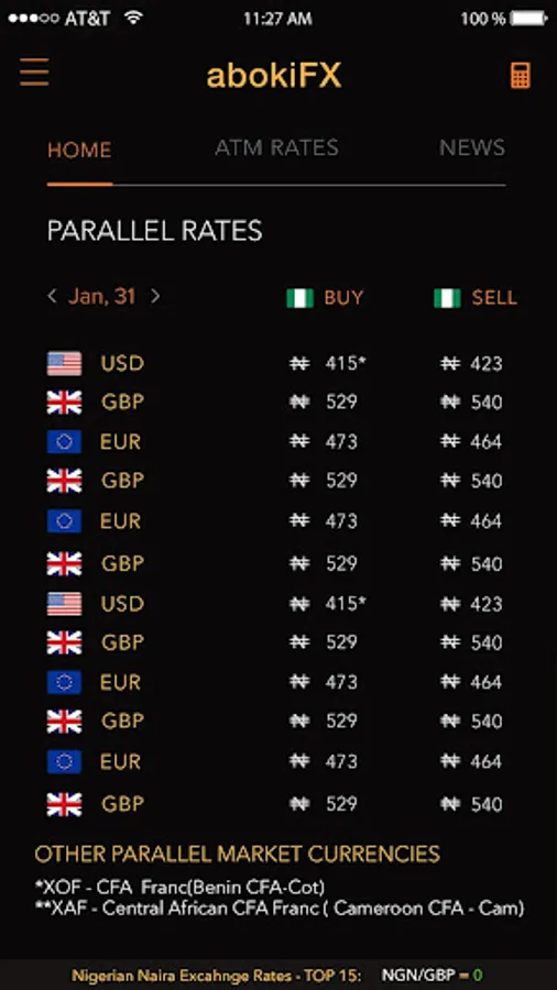 abokiFX provides you with daily naira FX rates against USD (dollars), (GBP) pound sterling, (EUR) Euro and other currencies such (GHS) Ghana Cedis, XAF and XOF Benin and Cameroon Francs. abokiFX also provides daily bank ATM rates, Market FX news, Aboki street news, CBN Rates, Lagos BDC rates, Moneygram and Wester Union rates. It comes with an inbuilt calculator to help ease your currency conversion.