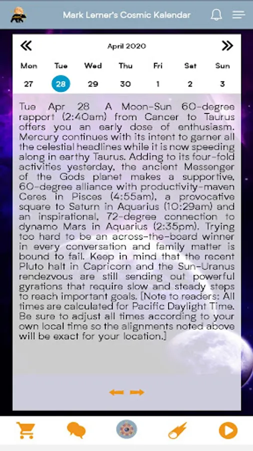 Go premium and you get access to the full calendar running 4-5 weeks into future, plus access to the Cosmic Chat area where you can engage and post with other astrology enthusiasts- including scheduled appearances with Mark Lerner himself! - and more exclusive subscriber content as described below.
