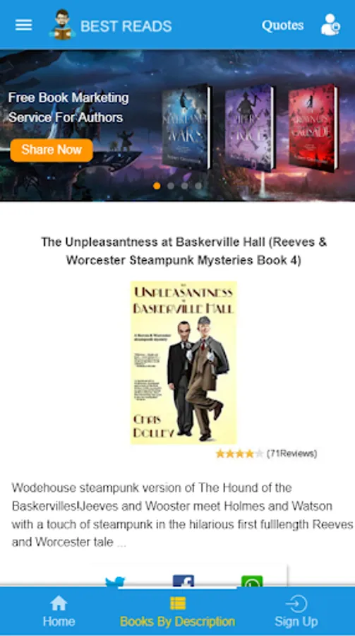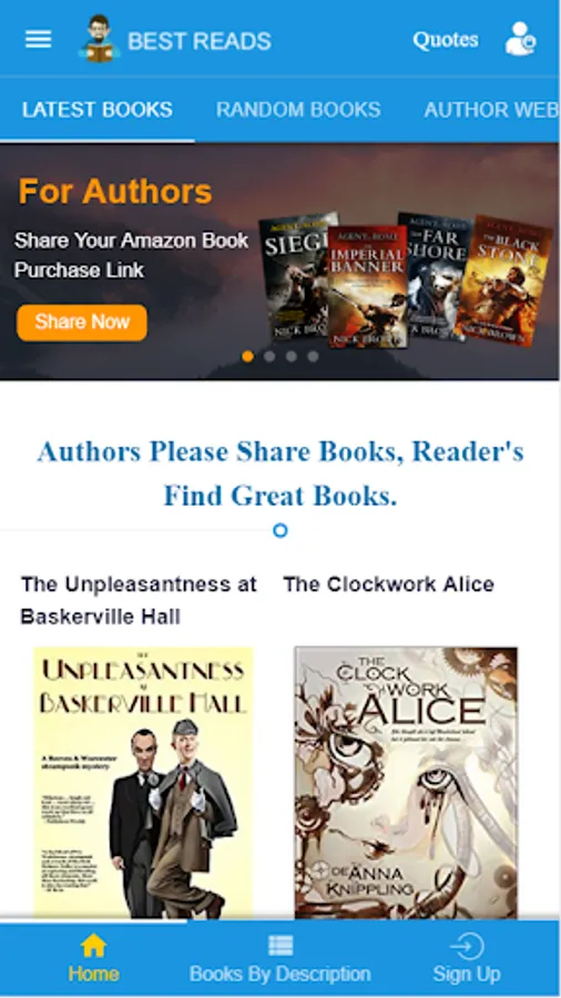 A very good App to discover famous authors books and website. You can share and read quotes. Share your Amazon book purchase link. We will promote that book.
