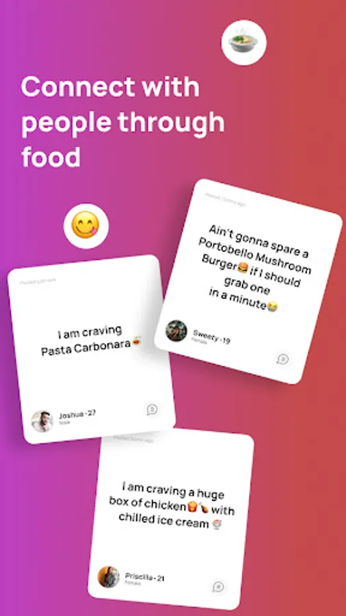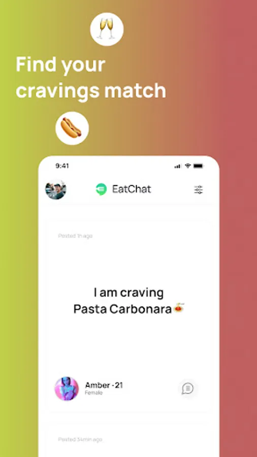 Time-Limited Cravings: All cravings on EatChat disappear after 24 hours, ensuring that every opportunity to meet someone new is fresh and exciting. Embrace the chance to meet, chat, and eat with like-minded individuals who share your passion for food.