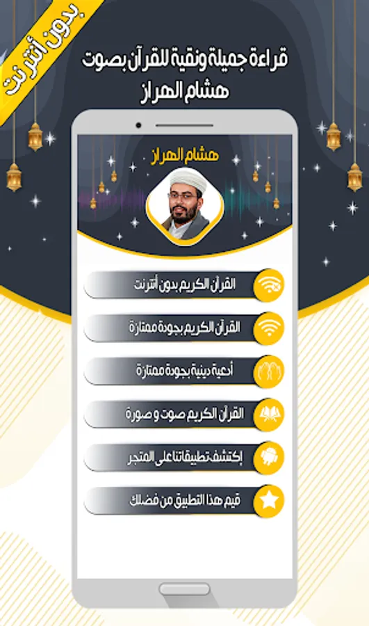 And you can evaluate the application of the entire Noble Qur’an with the voice of Hisham Al-Haraz without the Internet through the (app evaluation) option located in the application itself, and we will be very happy with that.