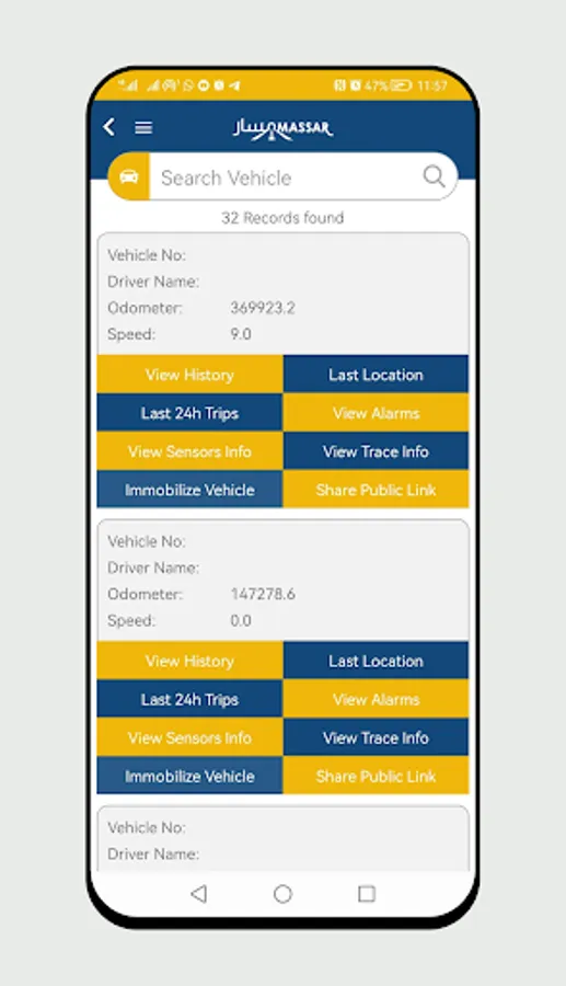 MassarTrack application is the mobile interface of the web application: https://aamt.massarsolutions.ae/. This application allows the users to have a live monitor of their vehicles and get alerted under certain conditions. Besides, it provides some simple reports to be be viewed through their tablet/smart phone devices.