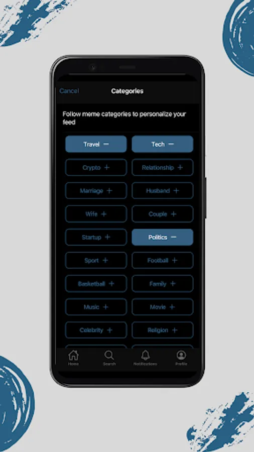 You can select topics of interest to customize your feed with related memes by clicking the plus icon on top right, click on feed preferences and select topics of interest.