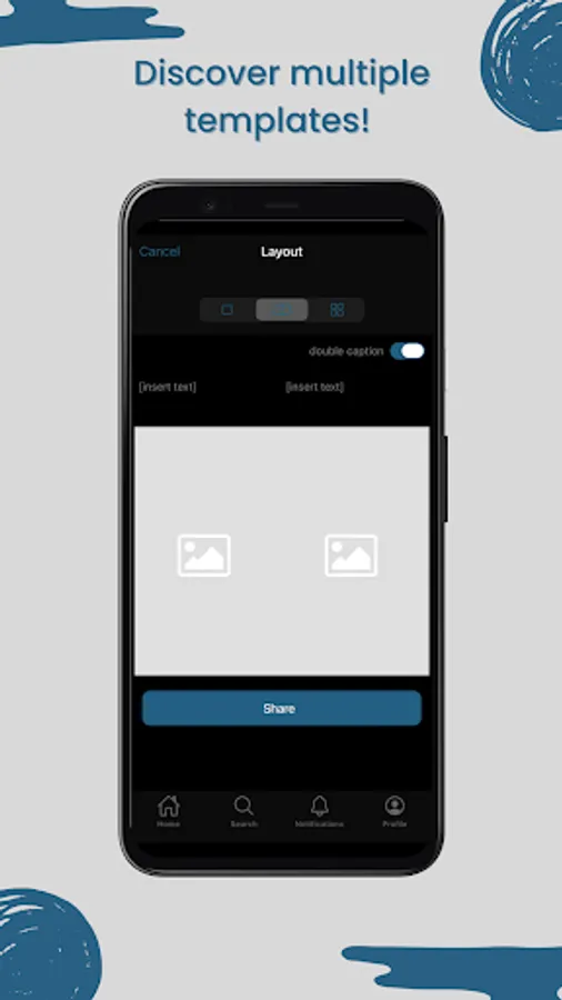 Click on the add(plus) icon on the application home page, select the template, and add media by clicking the media box and caption using the text field