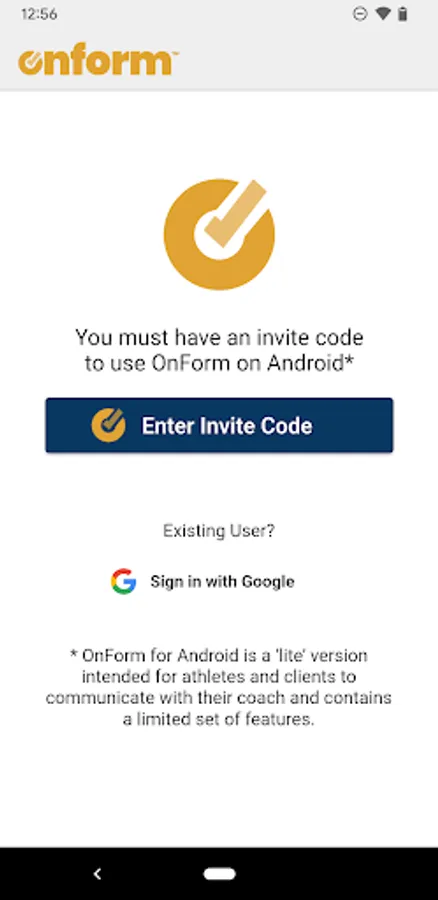 You must be invited by a coach or friend to use the Android version. OnForm for Android is a LITE version for coached athletes/students. You can only create an account using an Apple device.