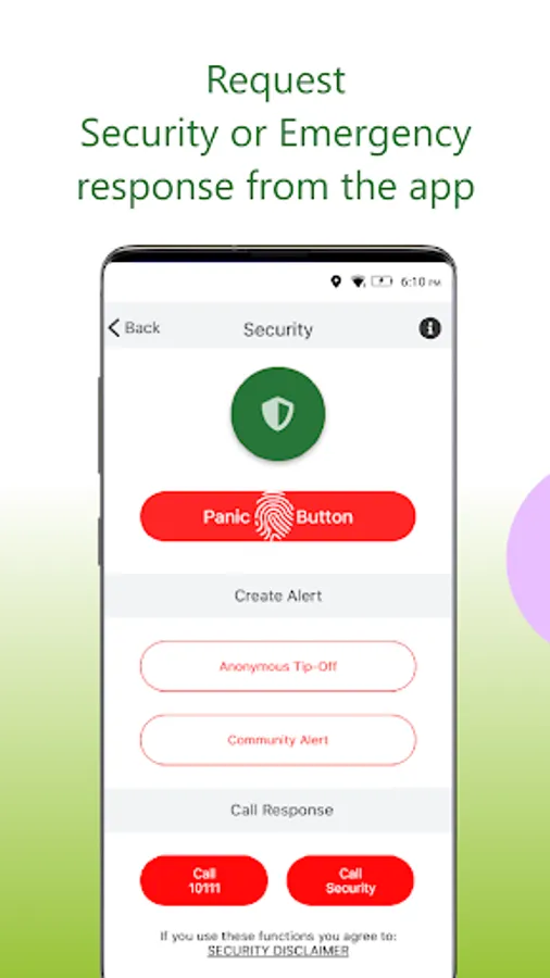The security button can be pressed to request immediate security response with your location, or you can send a community alert, or an anonymous tip off.