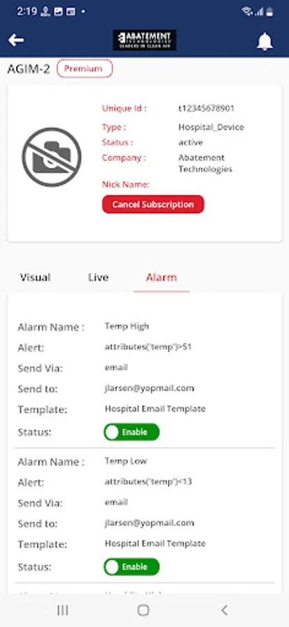AT-CONNECT is designed to create remote access to Abatement Technologies environmental monitoring devices. This app provides either event-based notification or live data access depending on subscription tier.