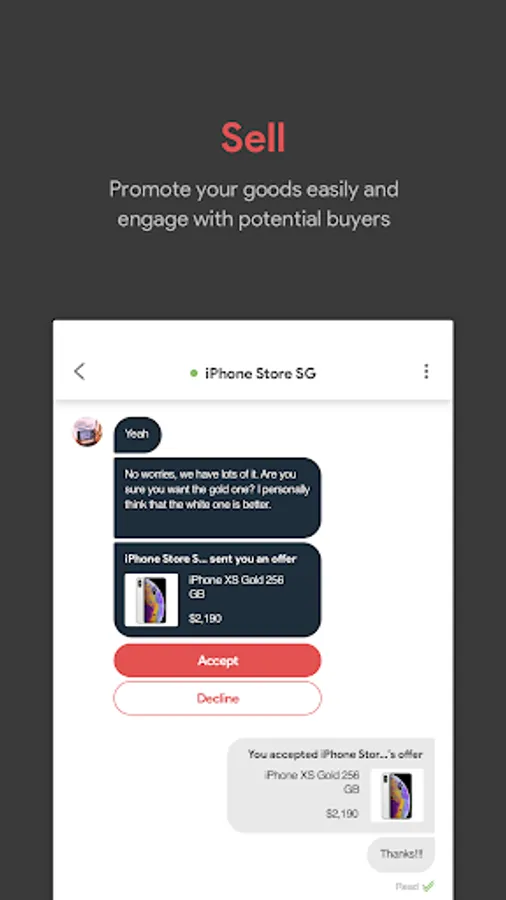 ✓ Chat & Purchase - The entire transaction process is integrated into the chat page. You can make an offer for a product, pay, complete the order and even start a dispute directly from the chat page!