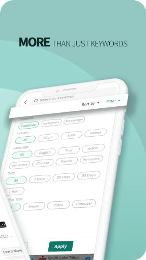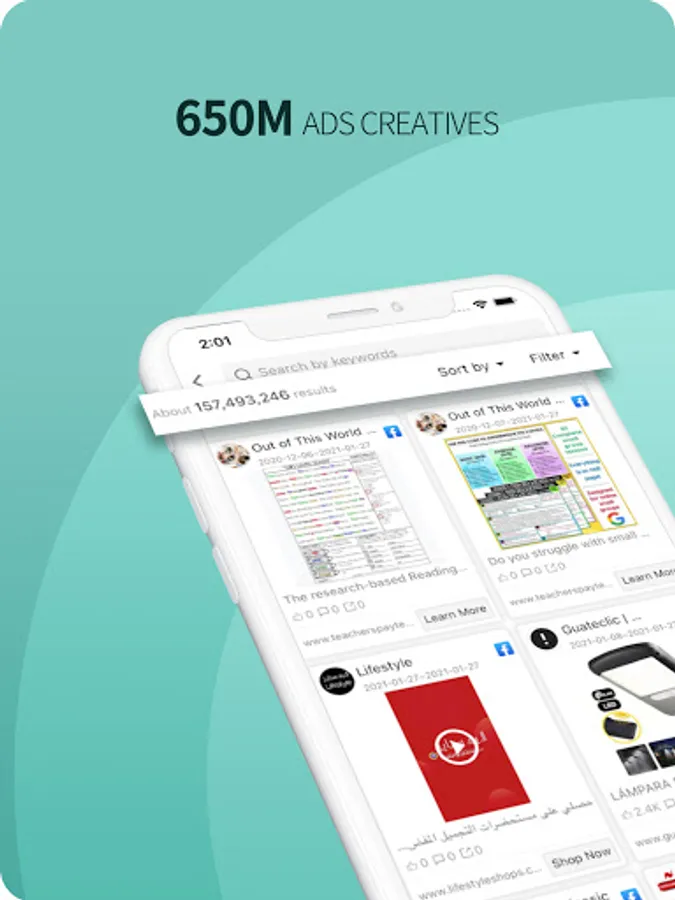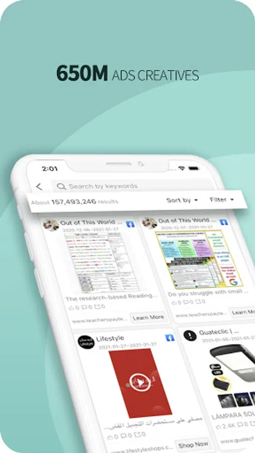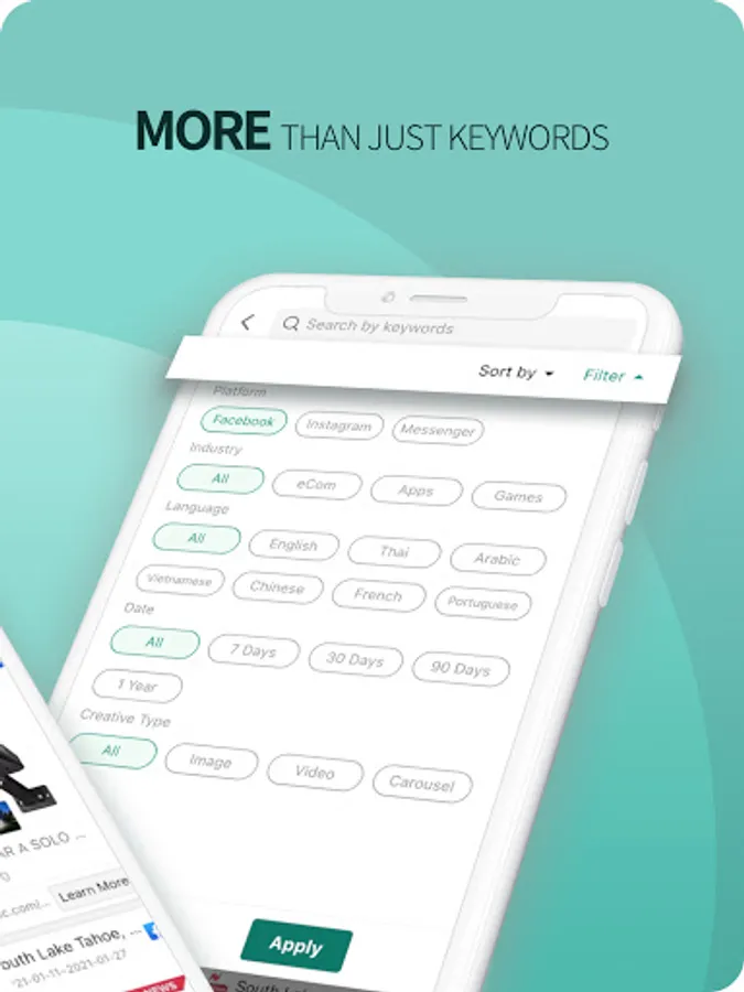 Whole network search: Search global advertising ideas on all platforms, and you can filter content in multiple dimensions such as SortBy, Page Categories, Language, CTA Types, Creatives, Device Types, Dates, etc.