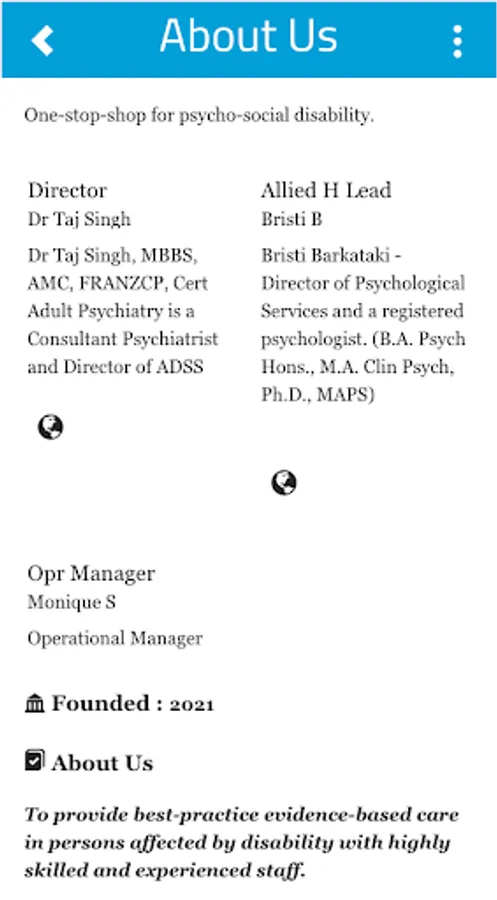 An app for disability support services to understand the processes for NDIS and avenues to get support. This app contains the forms and contact details about ADSS including NDIS videos