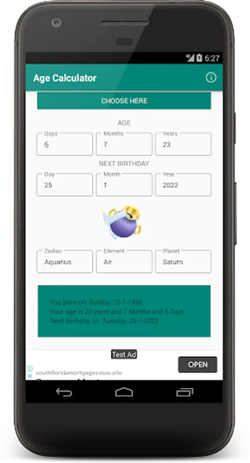 Age Calculator is simple app to calculate your age and day of birth, also you can calculate your zodiac sign, element for zodiac and planet of your zodiac by birth date.