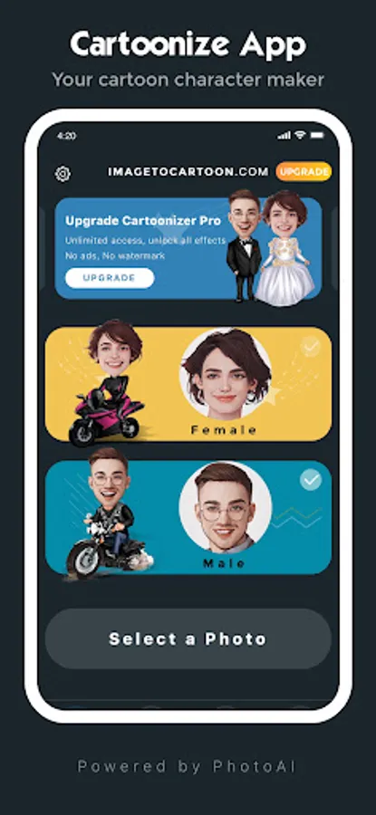 - Super easy-to-use cartoon app. Just select the gender and upload your selfie for processing