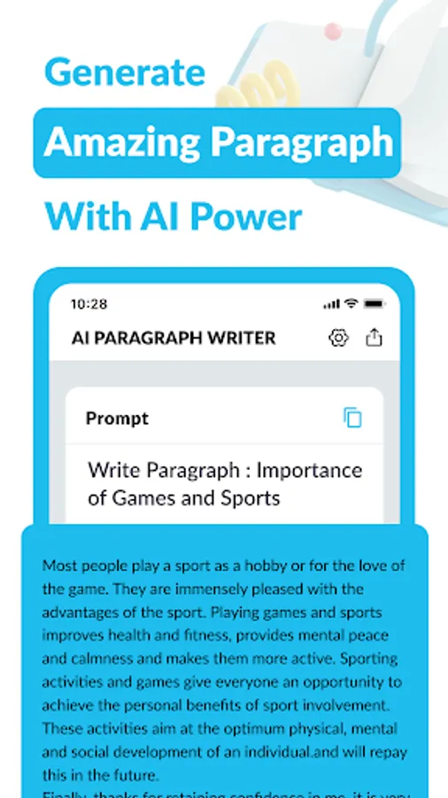Unlock your writing potential and let AI Paragraph Generator, Writer be your trusted companion on your creative journey. Download now to experience the power of AI-driven paragraph generation and witness a transformative shift in your writing process. Embrace the future of writing with AI Paragraph Generator, Writer and watch your ideas come to life with every word!