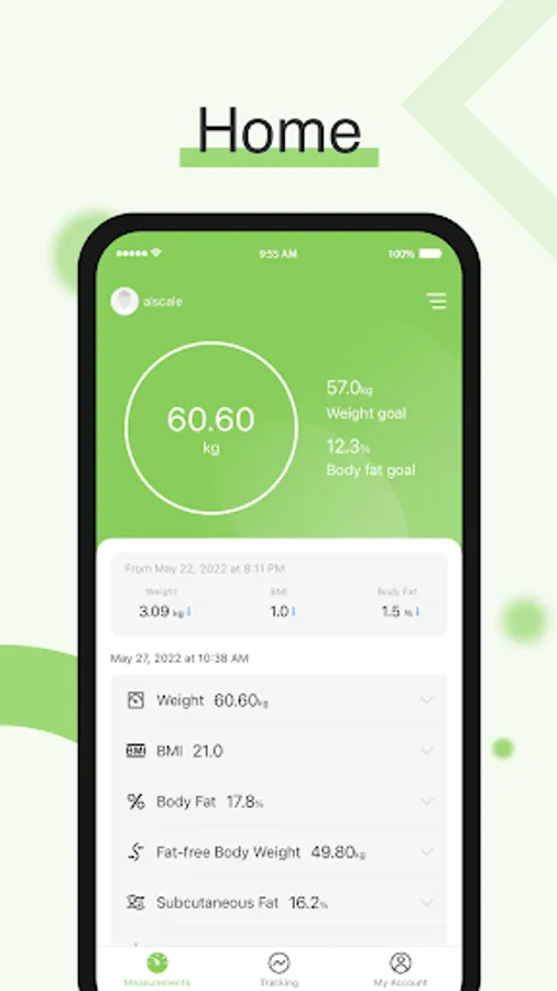 AI×Scaleは体重計と接続し、体重・体脂肪率など13項目の測定データをグラフ化し、健康管理をサポートします。