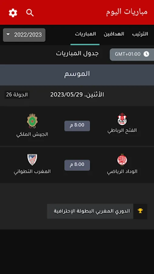 It contains the matches of the current, upcoming and previous round of the Moroccan Premier League