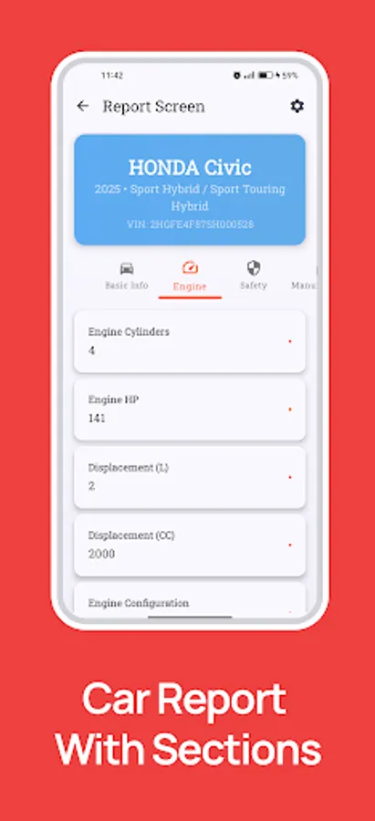 🚗 Detailed Car Report – Access information such as make, model, year, engine type, and more.