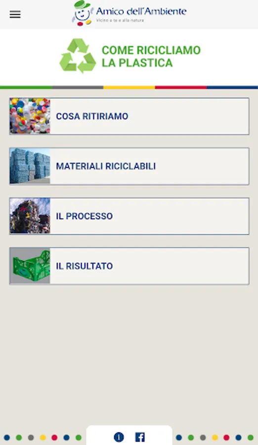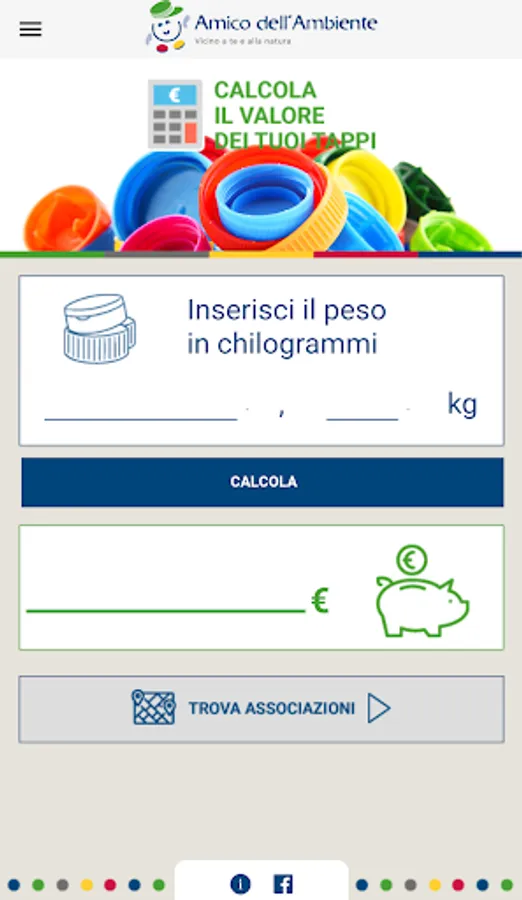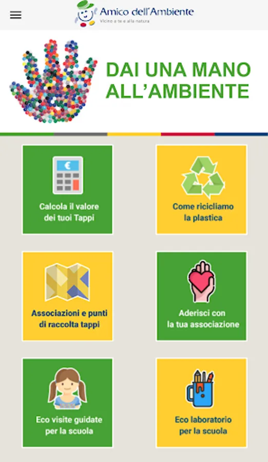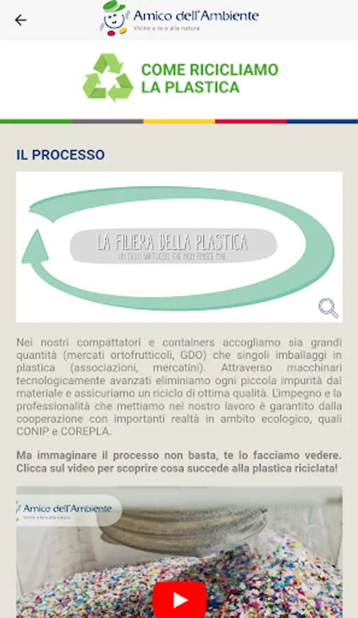 - Knowing the project: Environment Friend presents the initiative of the caps and collection of the plastic material, in which are illustrated purposes and advantages of the collection and recycling process. In this area you can also view the list of recyclable materials and the list of those that the company does not withdraw.