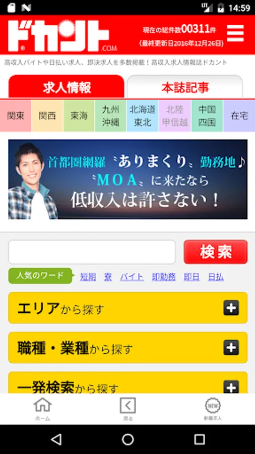 見やすく探しやすいのが特徴のひとつ。気になるワードを検索すれば、それに合う求人にヒットするはず。定期的に更新の「注目!ピックアップ求人」も目が離せない。高収入バイトの求人情報ならドカントにお任せください!