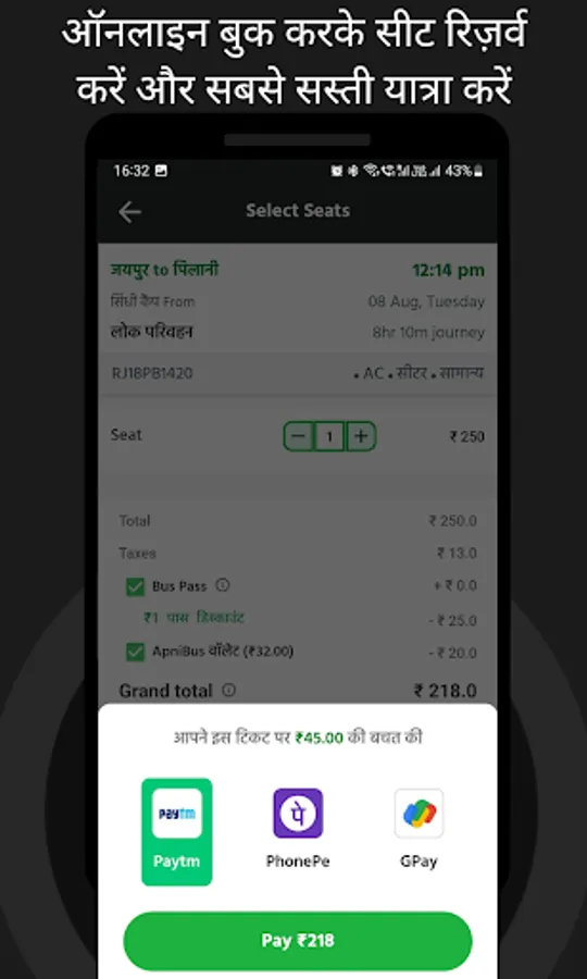 क्या आपको कंडक्टर से छुट्टे पैसों के लिए बार बार कहना पड़ता है या आपको बस टिकट के लिए छुट्टे पैसों की दिक्कत होती है? ApniBus फोनपे, गूगल पे, पेटीएम, यूपीआई या कैश जैसे आसान पेमेंट करने के तरीकों के साथ आपके बुकिंग के अनुभव को और आसान बनाता है। अब QR-मोबाइल टिकट पर स्विच करें और कैश-फ्री राइड करें। ApniBus पर सभी लेनदेन सुरक्षित हैं।🙂