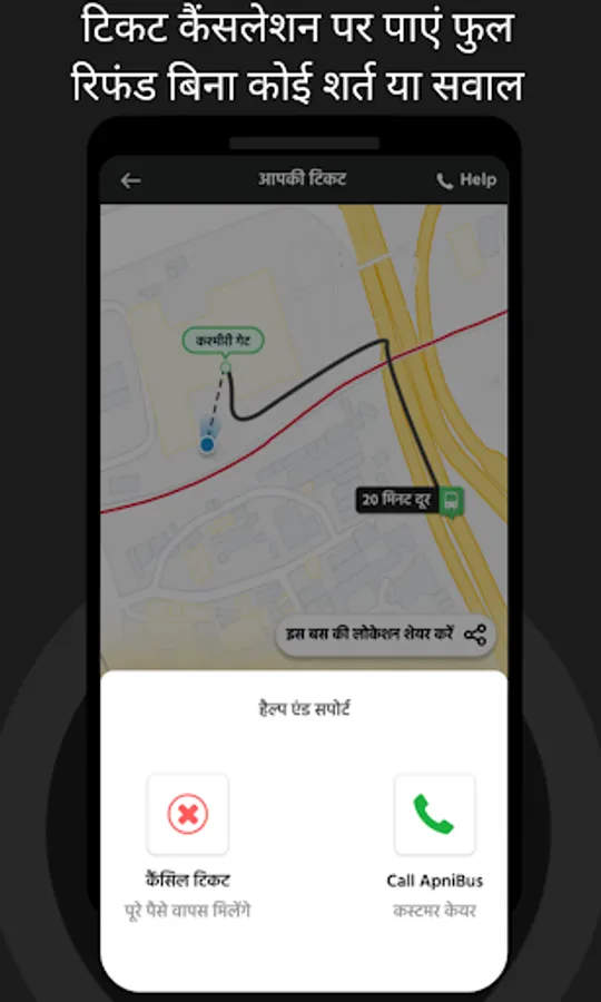 आपकी बस टिकट तुरंत बन जाएगी और आपकी अगली यात्रा के लिए कैशबैक तुरंत ही आपके वॉलेट में पहुंच जायेगा। यदि आप अपनी यात्रा कैंसल करने का निर्णय लेते हैं या यदि आपका पेमेंट किसी भी कारण से फ़ैल हो जाता है, तो हमारे पास इंस्टेंट रिफंड पोलिसी है, आपको जल्द से जल्द रिफंड मिल जायेगा। अब आप बेफिक्र होकर आराम से बैठें, और अपनी बस की लाइव लोकेशन ट्रैक करें। ApniBus के साथ परेशानी मुक्त और सुरक्षित यात्रा करें।🙂