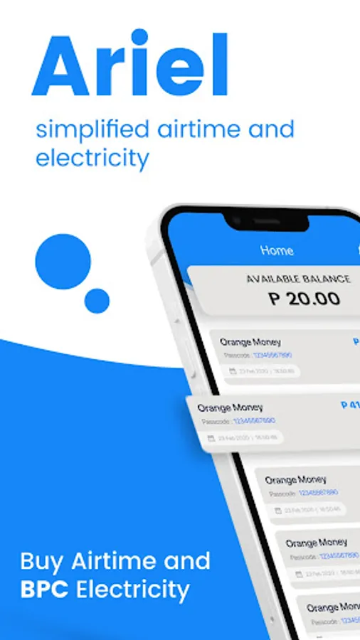 Introducing ARIEL, the ultimate app designed to simplify your airtime purchases and prepaid BPC electricity management. With ARIEL, you can conveniently buy airtime vouchers for leading providers such as Mascom, Orange, and BTC. Additionally, our app offers a seamless platform for prepaid BPC electricity purchases.